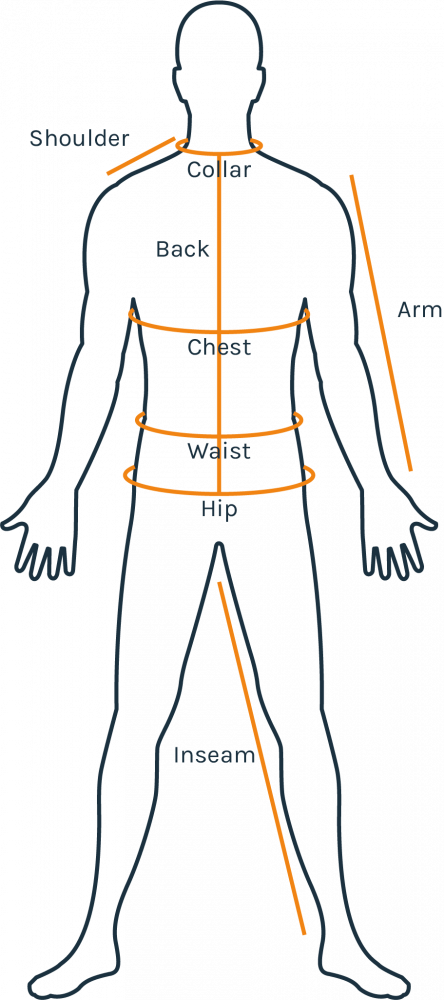 Body: Measure the length of the arm from the head of the shoulder (where your sleeve should start) till the transition from the wrist to the hand (where your cuff should end).